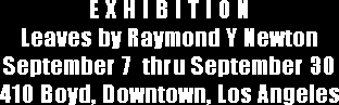 A reception for the artist will be held on Opening Night, September 7 at 8:00 p.m.; the public is invited and welcome. Admission and parking are free. The exhibit runs thru September 30. 410 Boyd [ Map ] is Open Monday thru Friday, from 11:00 a.m. to 10:00 p.m. and Saturdays from 5:00 p.m. to 10:00 p.m. In these spectacular 4 – 5 ft. tall photographic prints, the artist isolates a tree leaf on a white background. The minimal presentation emphasizes the natural form of the organic object in a dramatic relief. The massive scale in which viewers are confronted with the most mundane of nature’s objects is breathtaking – without being glued to a microscope we enter a world of pulsating life and subtle, inevitable decay. While his portraiture has managed an intimacy with its subjects that reveals much to the viewer about the subject, the photos in LEAVES underscore both the highs of beauty and lows of mortality in an interwoven, epic manner which reveals much to the viewer about his or her self. Raymond Y. Newton has called Downtown Los Angeles home for a majority of the past four decades. The city center and its diverse inhabitants have been the subjects for countless bodies of work in front of his camera’s lens and dozens of exhibitions throughout Southern California. In addition to fine art, his professional cityscape photography has been included in numerous film and media productions, including the 1993 Academy Award Best Picture PHILADELPHIA. For most of the 1990s he was the photo editor of the influential art magazine Coagula, where his documentation of the New York and Los Angeles art worlds became part of the look of the bi-monthly, must-read tabloid. Beginning in 1986 as the legendary Cocola, 410 Boyd upholds the heritage of Downtown L.A.’s dynamic visual art scene. Located at the border of Little Tokyo and the loft district, this legendary art bar continues exhibiting outstanding artistic talent. 410 Boyd began the 2006 summer exhibition schedule in July with paintings by Taz, a South African Expressionist who has called Los Angeles home for a decade. August followed with the popular Brazilian painter Tatianna Schulenburg. Raymond Y. Newton completes the trifecta of long-time Downtown L.A. artists-in-residence showing solo at the Boyd this summer.